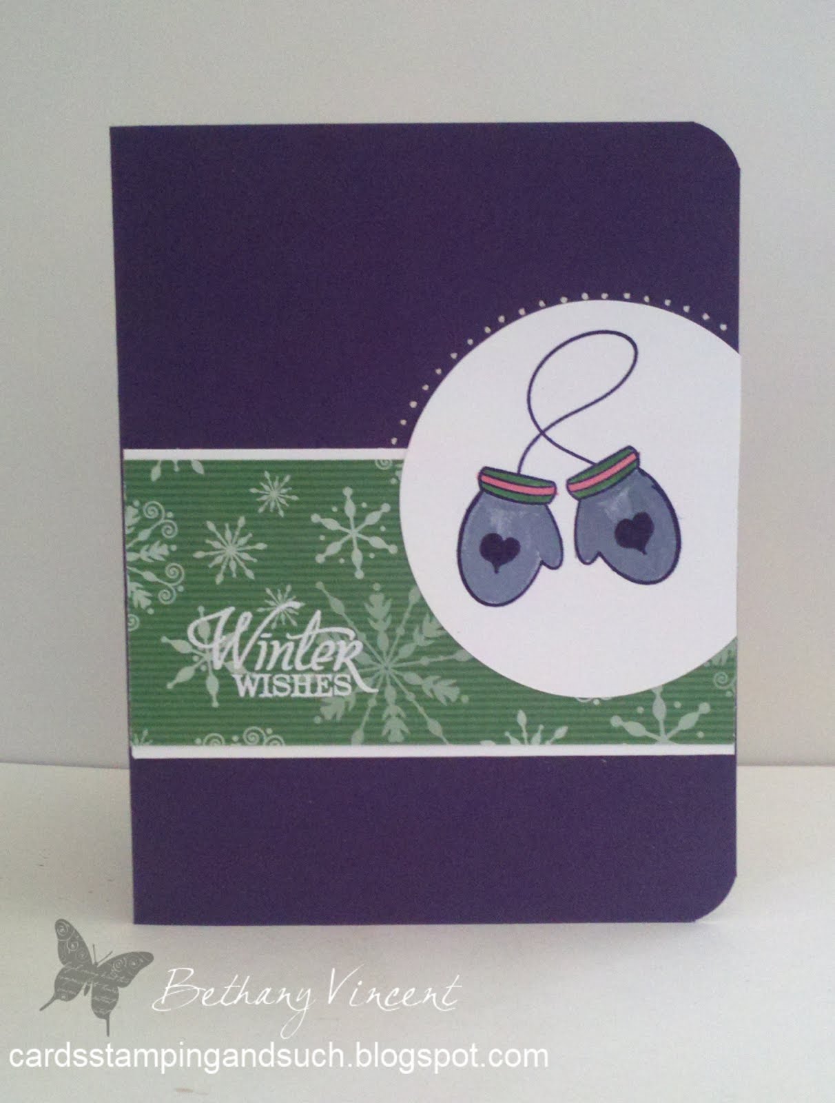 Even though it hasn't looked like winter most of the time this year, I've still been playing around with my winter stamps. This is a brand new set (for me) from Verve that I just love!! The mittens are just too cute! I colored them in with markers - wisteria, rose, garden green, and eggplant. I added the hearts free hand to dress them up. My card base is eggplant and then I used a strip of retired design paper to coordinate with the mittens. I embossed my sentiment with white powder so that it would show up better on the design paper. Lastly, I used my paper piercer to create a border around part of my focal point.